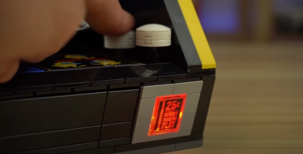 W zestawie znajduje się także inny ciekawy element – przycisk startu, który po wciśnięciu powoduje podświetlenie czerwonej cegły Lego, symbolizującej otwór na monety. Recenzent docenia również drobny szczegół, jakim jest lekko pochylona sekcja z otworem na monety, która nawiązuje do oryginalnego automatu.